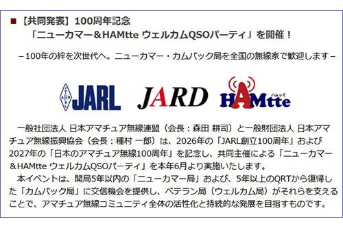 JARLとJARDは、共同主催による「ニューカマー&HAMtte ウェルカムQSOパーティ」を本年6月より実施すると発表した。