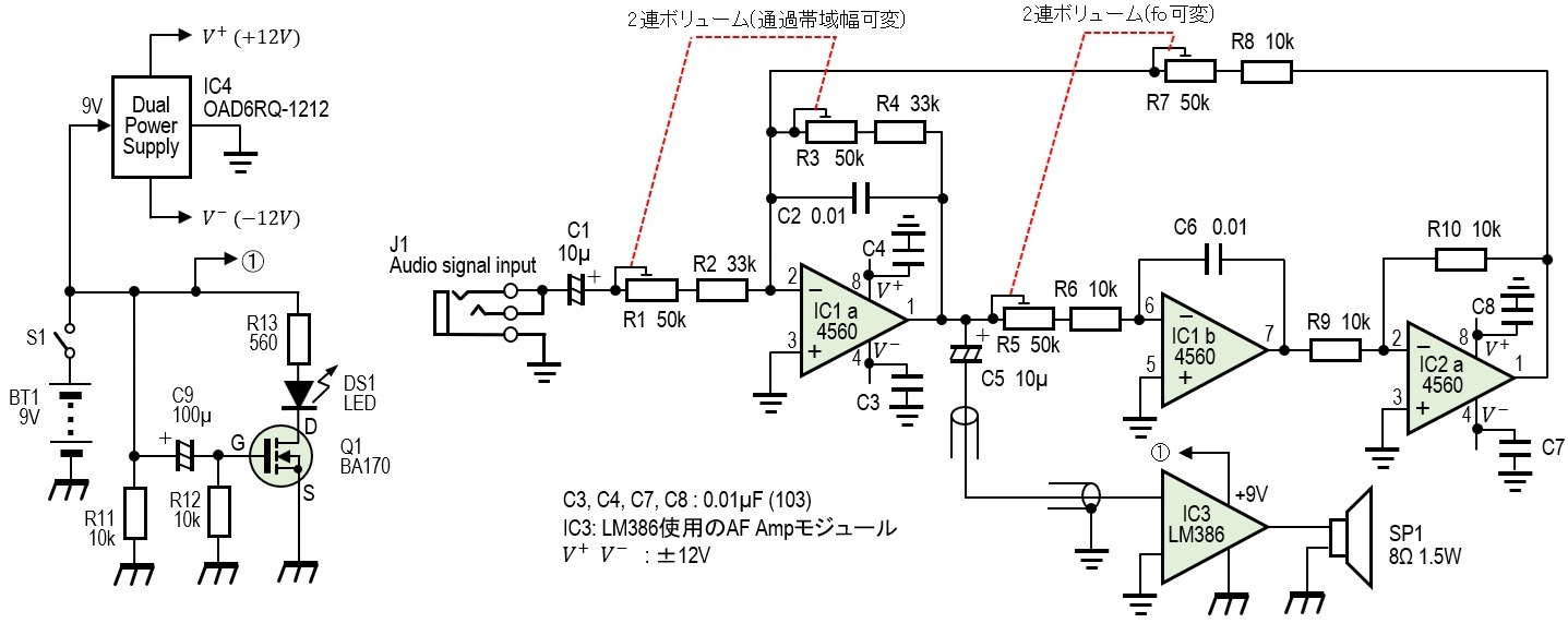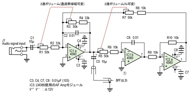 IC1、IC2で示す回路は、その1で示したバイクワッド型BPFです。R5とR7は50kΩの2連ボリュームを使っています。R5あるいはR7のいずれかを可変させることで通過信号の周波数を可変することができますが、大きく変化させたいことから2連ボリュームとしています。通過帯域幅を示すQは、R3で可変します。