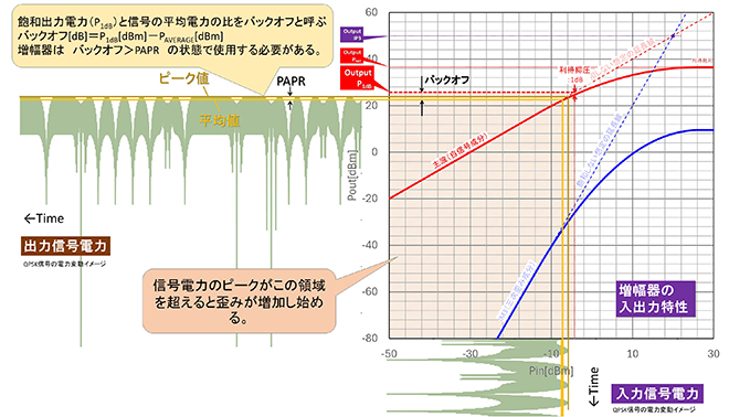 増幅器の飽和レベルに信号のピークを当てないためには、信号レベル(平均電力)を増幅器の飽和レベルよりもPAPR分だけ小さくする必要があります。信号の平均電力と増幅器の飽和レベルの比を“バックオフ(Back off)”と呼びます。このバックオフの大きさを、扱う信号のPAPRよりも大きく取ることによって、信号のピークが増幅器でクリップされたり抑圧されたりすることを防止します。言い換えると送信電力10Wを必要とする場合、信号包絡線が変動しないFM変調やFSK変調では飽和出力電力10WのHPAで済むところ、QPSK方式では、図3の②で示したPAPRから、約1.3倍の飽和出力電力13W以上のHPAを準備する必要があります。なお、ここで使用する“増幅器の飽和レベル”は第12話で解説したP1dBの値を用いるのが一般的ですが、256QAM等歪みの影響を強く受ける変調方式では、P0.5dBを増幅器の飽和レベルとするなど、厳しい条件を設定する場合があります。