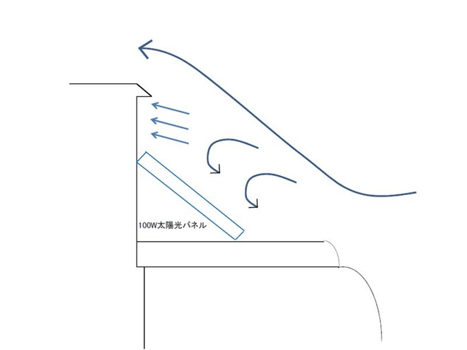 小さなパネルでは図のような空気の流れになり、パネル上部とシャック屋根との高さの差のある部分やパネルの前部分などで空気抵抗が発生しているのではないかと想像しています。