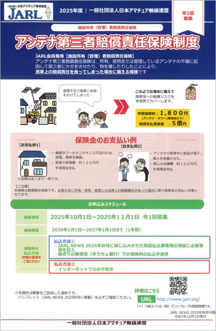 なお、タワーが2基以上ある場合も、同一敷地内であれば1か所として計算される。詳しい案内は「JARL NEWS」2025年秋号(10月発行)に掲載されているほか、JARL Webの案内ページ(https://www.jarl.org/Japanese/5_Nyukai/Hoken/antena.htm)でも紹介されている。