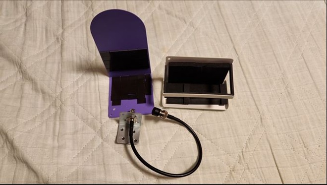 そんなことで、変更審査が終わるまでの待ち時間で、常置場所やホテル移動運時に使用するためのハンディー機用スタンドを製作しました。材料は100均グッズで鉄製の調味料入れやブックエンドを活用しました。調味料入れのハンディー機に接する部分にはシール付きのスポンジを使い養生を行い、調味料入れとブックエンドの合体はマグネットシールを使用しました。また、建設資材のLアングルでアンテナ基台を製作しました。ケーブルはBNC付のRG-58ショートケーブル30cmです。