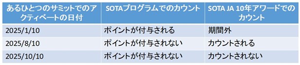 • *1 アクティベーションポイントが付与されるものに限る。ただし今年の6月1日以前に一度アクティベートしているサミットの場合、つまり2回目以降のアクティベートの場合、SOTAデータベース上ではポイントは付きませんが、このアワードプログラムの中では1回目のアクティベーションとしてカウントされます。下の例をご参照ください。