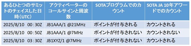 • *3 異なる10局のアマチュア局とはコールサインが異なる局。“/P”や“/1”などのサフィックスの違いはカウント対象としない。またSOTAデータベースでは1日のうちにひとつのサミットでのアクティベーションは1回だけでコールサインが異なる局でもチェイサーポイントは付与されませんが、このアワードプログラムの中では異なる局としてカウントされます。下の例をご参照ください。