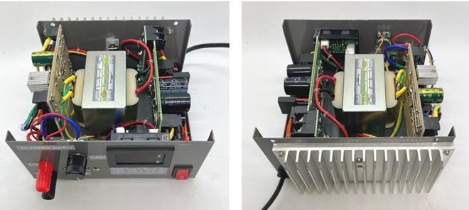 電源には電圧計、電流計はつきものですが、今回は針のメーターではなくデジタル表示の電圧・電流計モジュールを使いました。ケース表面の大きな穴がその電圧・電流計モジュールを取付ける部分です。