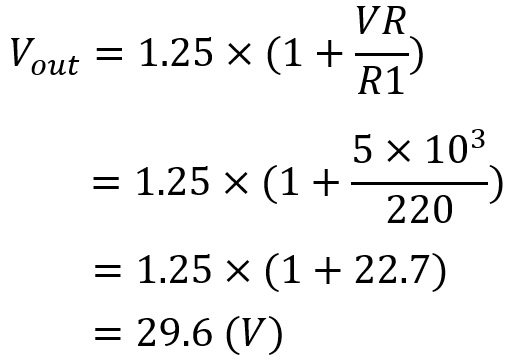 メーカーのデーターシートによると出力電圧は下に記す式で得ることができるとあります。試しにR1=220Ω、VR=5kΩを代入して計算すると29.6Vとなりました。実際の出力電圧は最大15.4Vであるのに対し、計算では29.6Vとなり腑に落ちません。よく考えると、IC1の入力には12Vをブリッジで整流した電圧を印加しているだけですので、出力電圧は入力電圧以上にはなるはずがありませんでした。