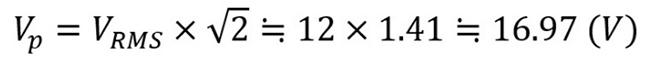ここでAC電圧の定義を考えてみます。「AC 12V」とはRMS値(実効値)を指します。AC電圧の最大値(Vp)は次の式で求めることができます。