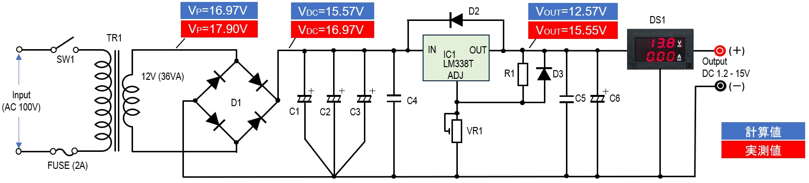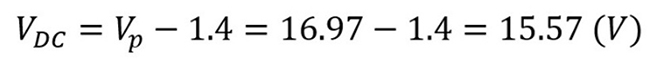 一方、AC 12Vをダイオードブリッジで整流するためダイオード1個あたり約0.7Vの電圧降下を生じます。2個のダイオードを通過するため約1.4Vの電圧降下となります。したがって整流後の出力電圧(VDC)は下に記す計算式のように15.57Vとなり、この電圧がIC1の入力電圧となります。