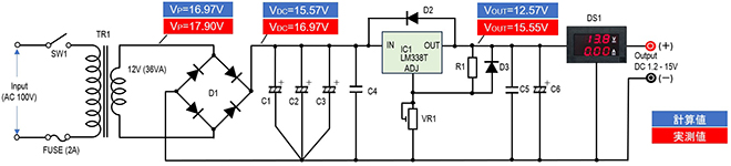 一般的に三端子レギュレーターが安定して動作するための入力電圧と出力電圧の差(ドロップアウト電圧)は2.5~3Vです。つまり、三端子レギュレーターの入力電圧より2.5~3V低い電圧が出力電圧となります。これからすると最高出力電圧は最小で15.57-3=12.57Vとなるはずです。