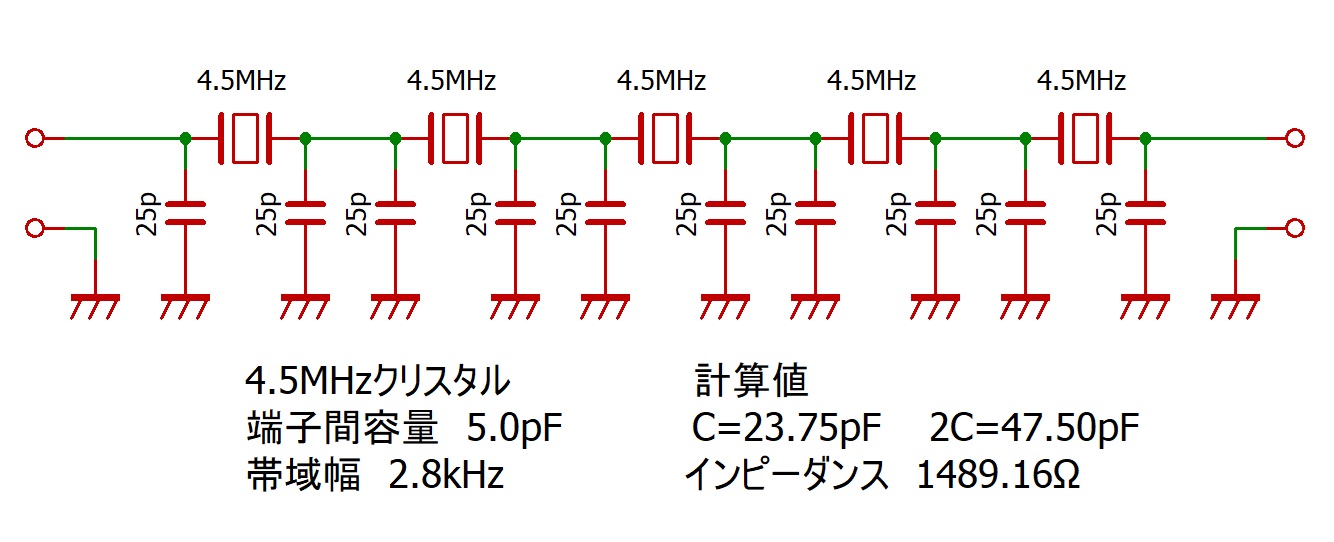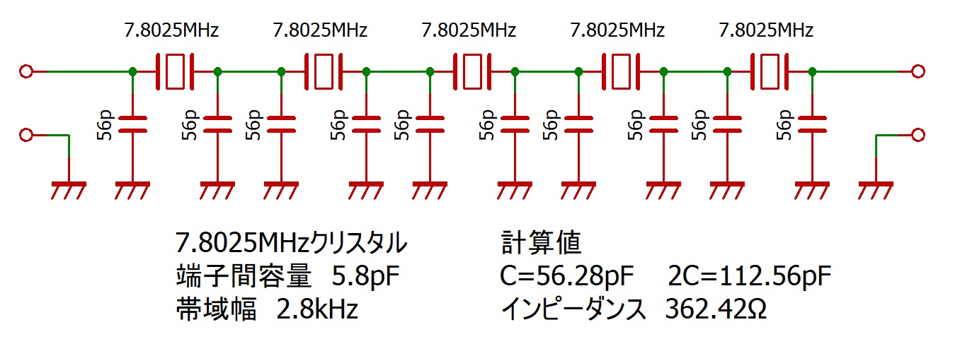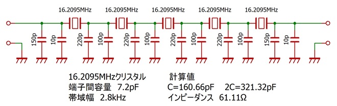 5素子のラダー型フィルタとして、図1の回路としました。押し込めば7素子も可能かもしれませんが、まあ最初ですので5素子で良い事にしました。今のところ私の作るものであれば、性能的に5素子で充分と思います。その方が性能的にバランスは良いのですが、今後は7素子も作ろうと思います。