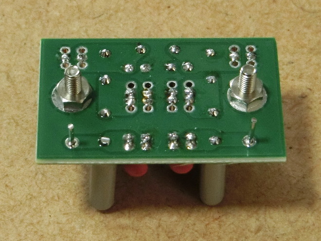 一般のクリスタルフィルタと同様に、ネジは2.6mmを固定用に用いました。写真5のように2.6mmのネジをナットで一度固定して、そのまま多少浮かせたまま本体側の基板に入れて再度ナットで止めて固定する方法にしました。このようにすれば、ハンダ部分は本体側の基板と接触しません。もちろん、ハンダ面に出る足は短く処理します。