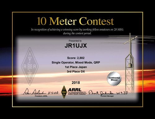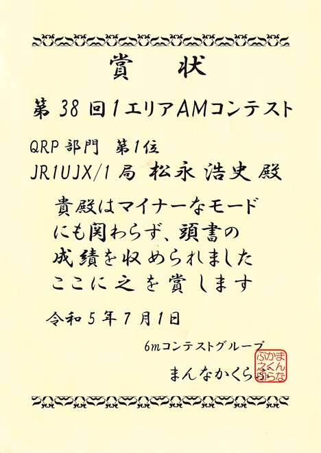 一点不明点がございます。入賞について昨年の規約では「1~9各エリアと長野県・新潟県の上位局に賞状を贈る」となっておりますが、結果をみると0エリア外は一括され上位局が表彰されているようです。今回も入賞に関する記載は同じですので、興味がある方は主催者へお尋ねください。