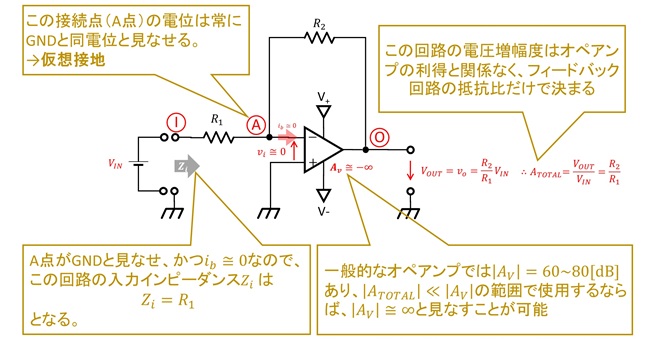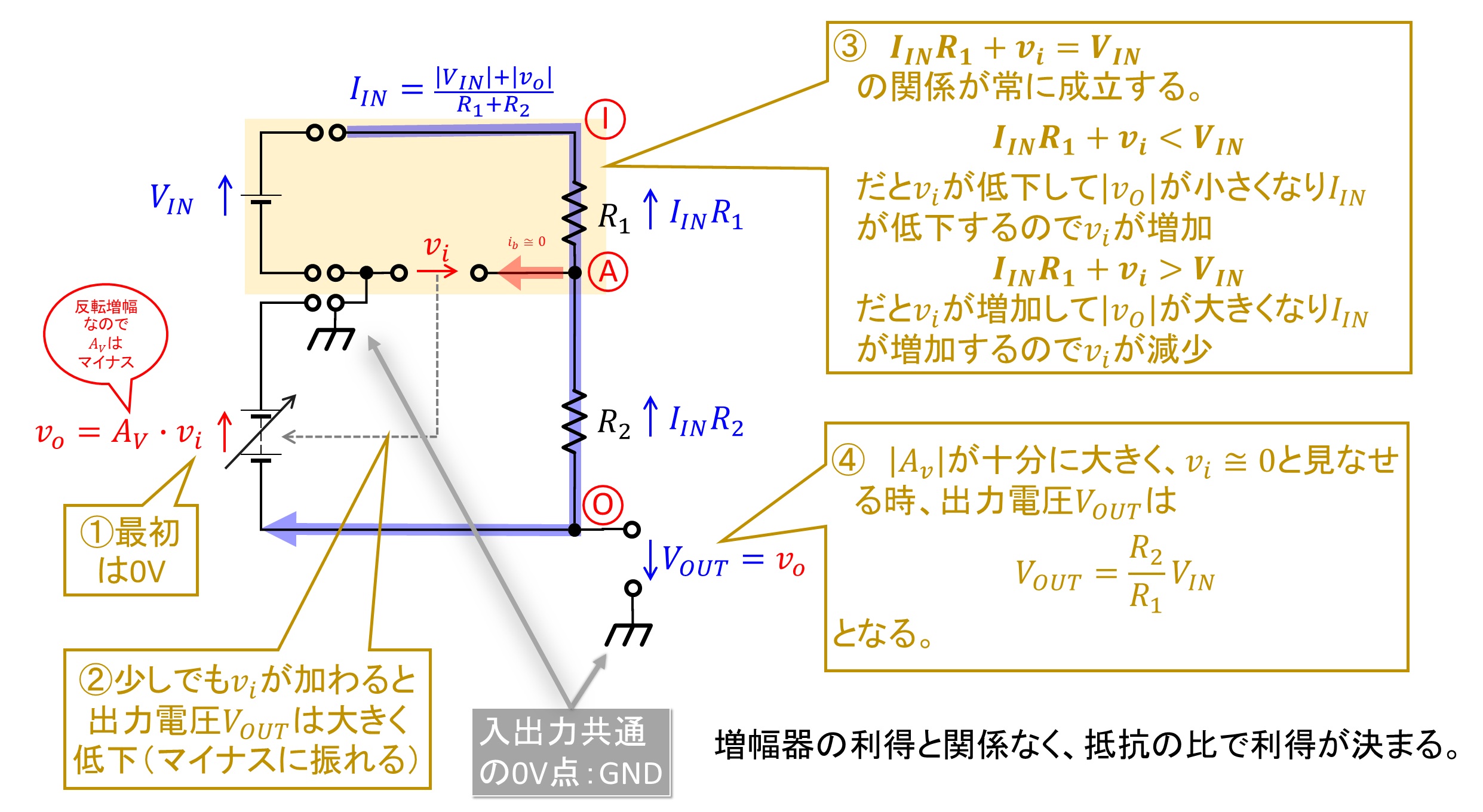 R1 とR2 で負帰還回路を構成しています。回路の入力に電圧VIN が印加されると、R1 を介して増幅器の入力に電圧