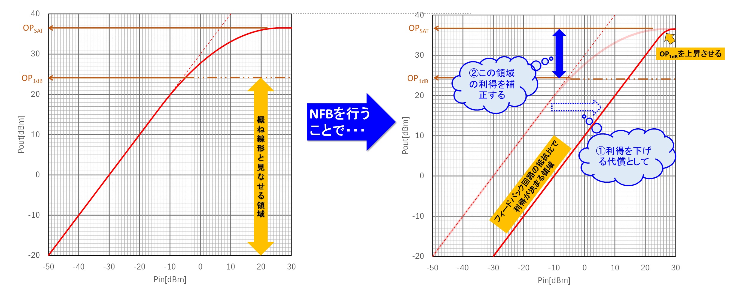 図から判るように利得の小さい増幅器でも、負帰還を行って増幅器単体利得AV の1/10程度の回路利得ATOTAL で使用することにより、回路のP1dBを5dB程度改善することが出来ました。但し効果は限定的といえます。このように負帰還回路による直線性(歪み)の改善は、増幅器の利得を大きく下げて利用する、言い換えると裸の利得が大きい増幅器でなければ大きな効果は得られないという本質的な問題を抱えています。また増幅する信号の振動周期(周波数)に対して、帰還回路の遅延時間が無視できなくなると、負帰還回路が負帰還にならずに回路動作が不安定になります※1。このため無線通信用の高周波増幅回路では、発振防止目的の位相補正を除き、このタイプの負帰還回路はあまり利用されません。