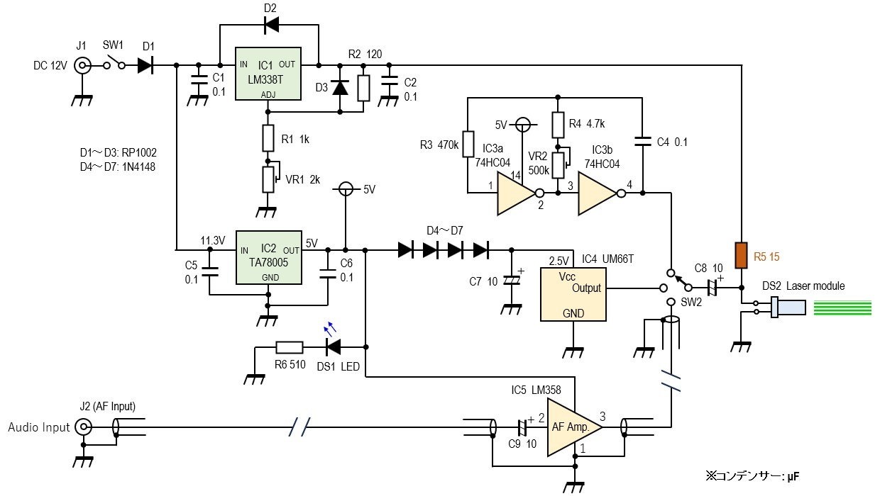 回路図のR5(15Ω)は多くのレーザーモジュールでは、なくてもVR1で電圧を調整するだけで変調はかかりましたが、レーザーモジュールによってはここにこの抵抗を挿入することでより深い変調が掛かりました。