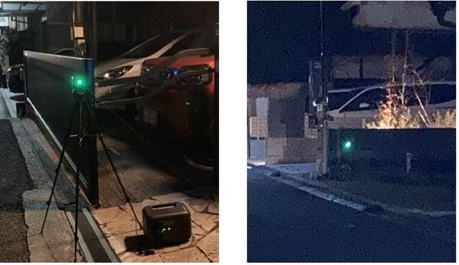 夜間はレーザー光がよく見えるので通信実験はしやすいです。図7左は製作した送信機がグリーンのレーザー光を照射している様子です。