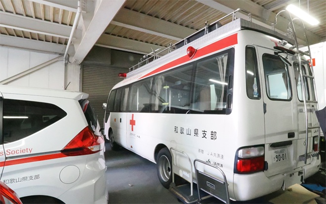 まずは建物1階にある車庫へ! シャッターをガラガラっとオープンすると、赤白お揃いのカラーに塗り分けた和歌山県支部の車両が何台も駐車していました。