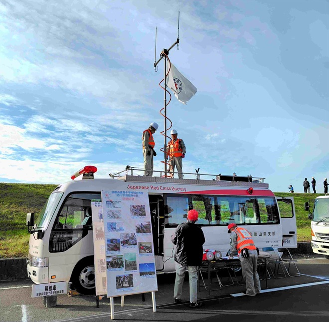 無線車の訓練参加風景。太い伸縮式ポールを伸ばしてアンテナを取り付けています(和歌山県赤十字特別救護隊画像掲示板より)