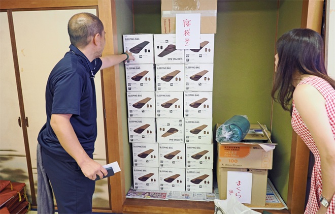それだけではなく、押し入れには寝袋やまくらなどが入った箱がたくさん!! 小森さんに伺ったら、この和室は災害時に避難者を受け入れたり、対応する職員やボランティアの皆さんが仮眠したりできるような準備が整っているそうです!