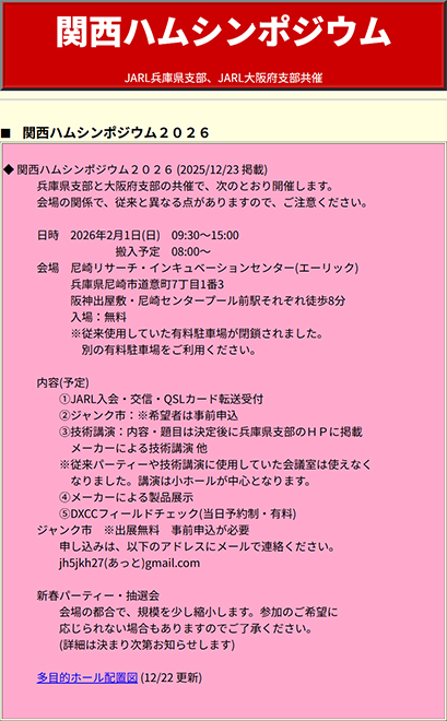 関西ハムシンポジウム2026の公式ページ。今後も随時情報が更新される