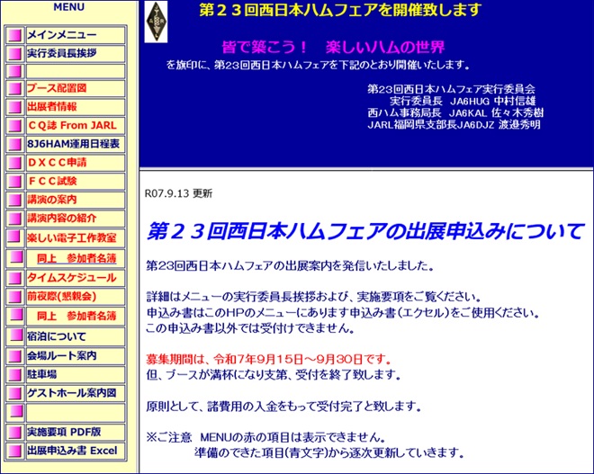 - ・備考: 3月初旬の日曜日に開催されることが多い、西日本最大のアマチュア無線イベントで、50以上のブースが体育館内に並ぶ姿は壮観の一言。昨年は2,000名以上が来場した。今年は3月8日の開催を目指して準備が進行中で、出展者向けの実施要項が公開されている(出展申し込みは締め切り済み)。前日の3月7日(土)には地元ホテルで恒例の前夜祭(有料)が行われる。