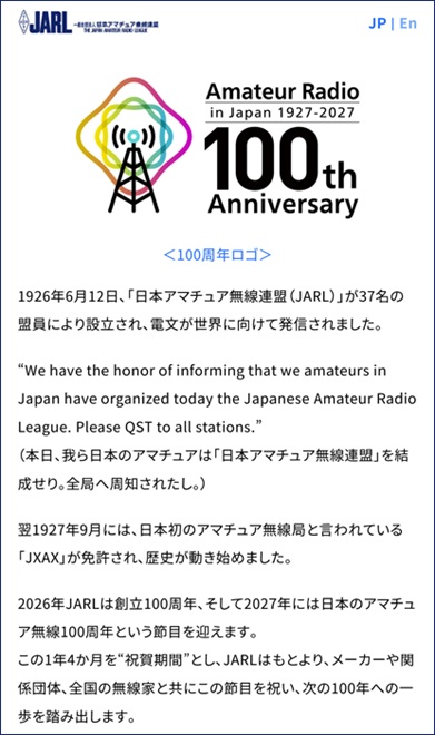 JARLが開設した“100周年イヤー”をPRする特別ページ