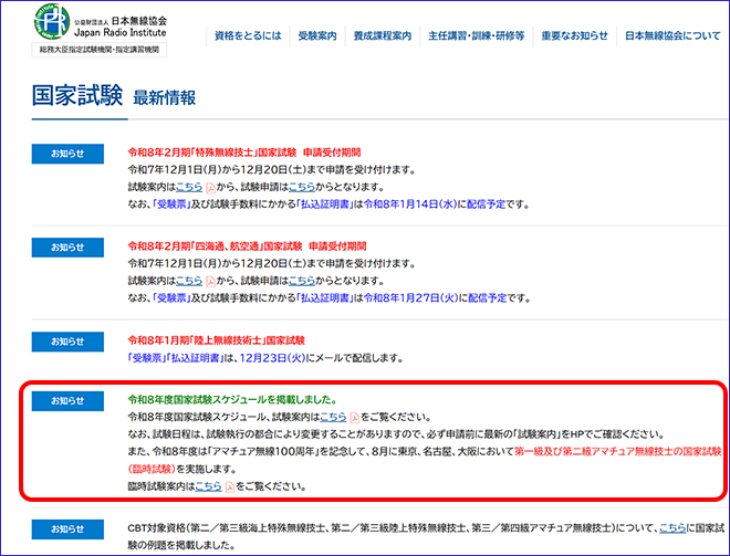 日本無線協会Webサイト 国家試験最新情報