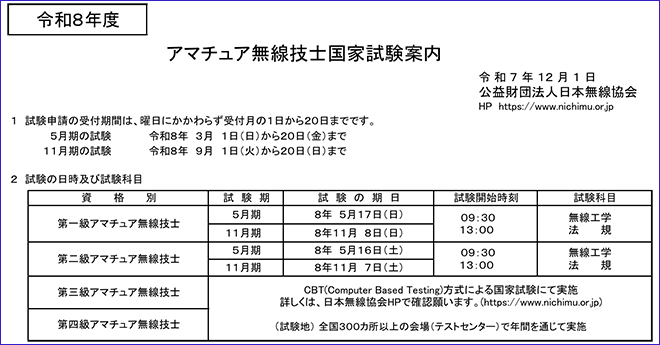 無線従事者国家試験の指定試験機関である公益財団法人 日本無線協会が、令和8年度(2026年度)に行う「第一級アマチュア無線技士(1アマ)」および「第二級アマチュア無線技士(2アマ)」の国家試験日程を発表した。