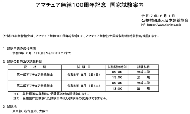またアマチュア無線100周年を記念して行われる臨時試験は、1アマが8月2日(日)、2アマが8月1日(土)に実施され、受付期間は6月1日(月)の0時から同20日(土)23時59分までとなっている。なお試験会場は東京都、名古屋市、大阪市の3箇所であることに注意、詳細は日本無線協会Webサイト アマチュア無線100周年記念 国家試験案内を参照していただきたい。