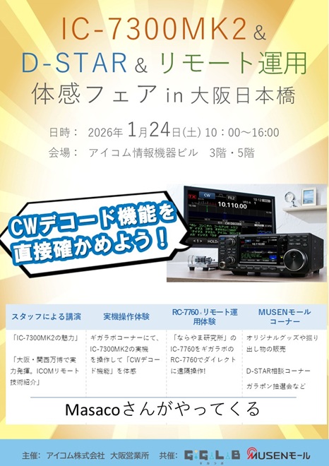 アイコムのベストセラー機であるIC-7300をさらに進化させた期待の新モデル、IC-7300MK2の魅力を存分に味わうことができる特別なイベントが大阪日本橋で1月24日に開催される。昨年11月には東京両国でアイコムフェアが開催され、IC-7300MK2が実働展示されたが、西日本でIC-7300MK2を実際に見て触れられるイベントが開催されるのは初となる。