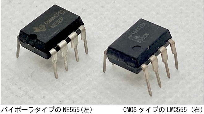 図1. タイマーIC 555の外観。バイポーラタイプもCMOSタイプも同じ形状