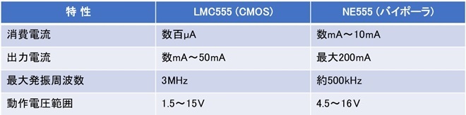 信号を発生させる素子にはタイマーICで有名な555を使用します。555はバイポーラタイプのNE555がよく知られていますが、今回の製作は電源を乾電池とするため、消費電流の抑制、また発振周波数をMHz台まで持ち上げたいということもあり、CMOSタイプのLMC555を使います。