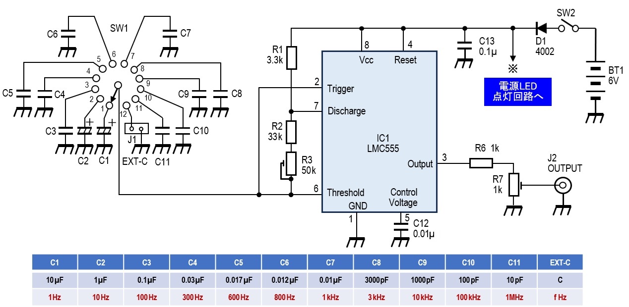 IC1 pin3から出力される信号の周波数は、C1~C11とEXT-Cに接続されるコンデンサの値で決定します。図4の回路図に示した、ロータリースイッチのポジションとコンデンサの容量、また発振周波数の対応表は公式で求めた計算値であり、実際はこのとおりの周波数が正確に出力されるものではありません。
