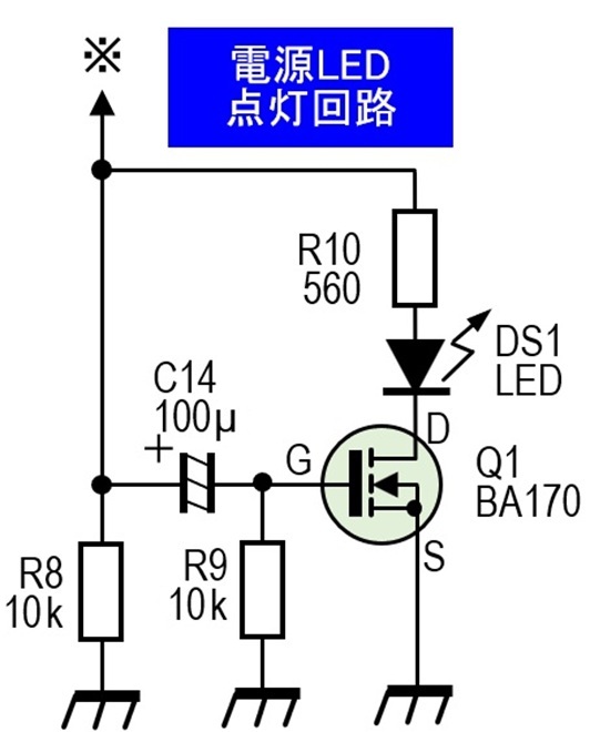 図4に示した回路図中に「電源LED点灯回路」と青色で示した部分があります。ここには、図5に示した回路を接続します。この回路は接続しなければ555が動作しないというものではありません。なくてもOKです。