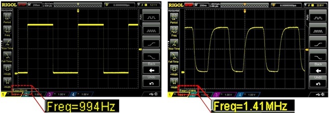 図12. 出力波形 左:994Hz 右:1.41MHz