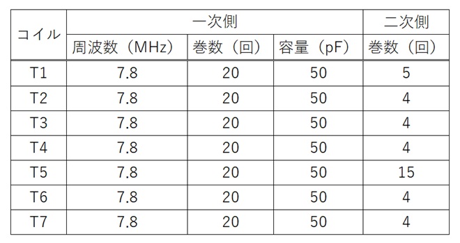 表1 コイルの巻数の指定(T7は不使用、巻数も容量も要調整)