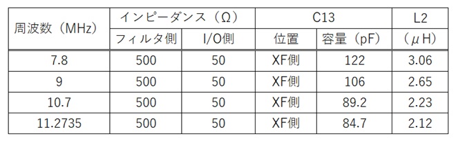 今回はクリスタルフィルタにラダー型を使う事も想定し、図7のようなLCのマッチング回路にしました。IFの周波数やクリスタルフィルタのインピーダンスによって、LCの値が変わりますので注意して下さい。一般的にはC13はクリスタルフィルタ側だけに付けます。この回路と主な値は表2のようになります。これは500Ωから50Ωへのケースですので、メーカ製のクリスタルフィルタを使う時になるのでしょう。XC=166.67ΩでXL=150Ωとなります。ラダー型の場合は値が全く異なりますので、個別に計算するしかありません。まあ、C12側のマッチングはしていませんので、不充分なのですが・・・。
