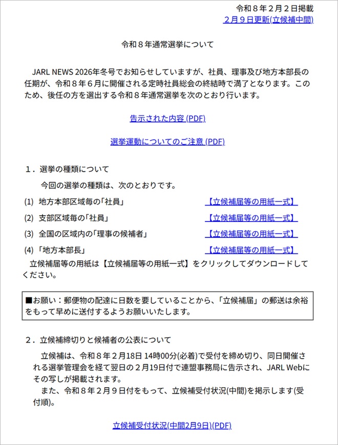 なお2月9日(月)に中間発表として、同日17時現在における立候補者の受付状況(中間)がJARL WEBで掲示された。それによると、全国の区域内の理事の候補者で3名、地方本部長(地方本部ごとの理事の候補者を兼ねる)で5名、地方本部区域ごとの社員で24名、支部区域ごとの社員(支部長)で20名の立候補を受け付けたという。