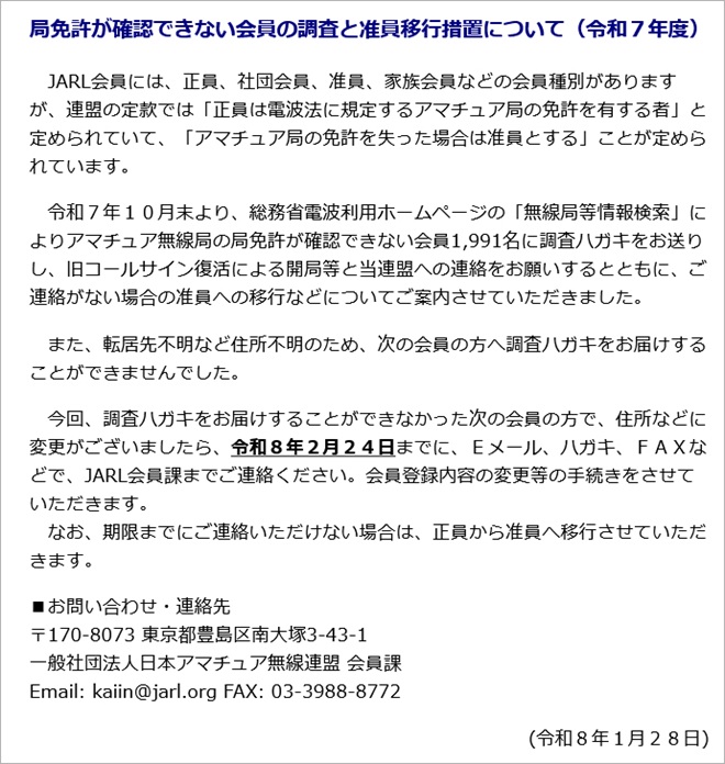 その上でJARLは、「今回、調査ハガキをお届けすることができなかった次の会員の方で、住所などに変更がございましたら、令和8年2月24日までに、Eメール、ハガキ、FAXなどで、JARL会員課までご連絡ください。会員登録内容の変更等の手続きをさせていただきます。なお、期限までにご連絡いただけない場合は、正員から准員へ移行させていただきます。」と案内している。