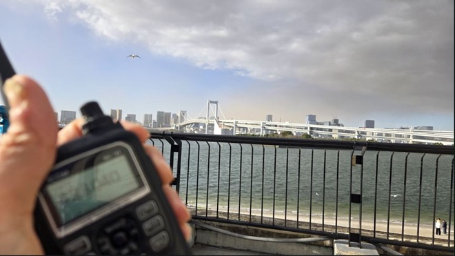 この日のお台場海浜公園は時折、突風が吹き荒れ、自身の身体も吹き飛ばされそうになり、また、砂浜の砂も舞い上がるほどでした。ここでの運用場所は案内所・マリンハウス3階の展望台です。1時間ほど運用しましたがバンド内には数局の信号が聞こえる程度でした。CQを出し始めると地元局からのコールバックがありました。その後、信号が強めのCQ局に応答し、何とか2局の交信実績ができました。
