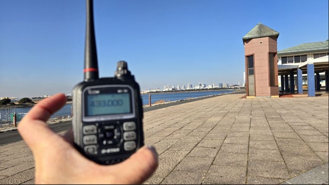 - (イ)その後、向かったのは辰巳の森海浜公園です。「晴海埠頭」バス停から都営バス「錦13甲」系統で「豊洲駅前」バス停まで行き、都営バス「門19甲」系統を乗り継ぎ、現地に15時過ぎに到着しました。バンド内をワッチすると先ほどとはうって変わり閑散としていました。「これはもしかすると、ここまでやって来たのにボウズか」と考えながらCQを出しました。15分ほど経過してから強い信号でこちら呼ぶ声が聞こえました。「ありがたい!」地元局からのコールバックがあり、この地での交信実績ができました。滞在時間30分ほどで2局と交信でき、ほっとして路線バスに乗り込み帰路につきました。