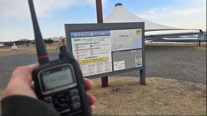 - (ア)中央林間駅・駅前QRVのあと東急田園都市線・大井町線、JR線を乗り継ぎ、リベンジ運用のため葛西海浜公園を訪れました。今回はちゃんと葛西渚橋を渡りたどり着きました。運用時間は45分ほどでした。CQを出し始め2局と交信ができ、その後、相模原市、八王子市のCQに応答してコールするも応答がありませんでしたが、強い信号のCQに応答するとコールバックがありQSOが成立しました。