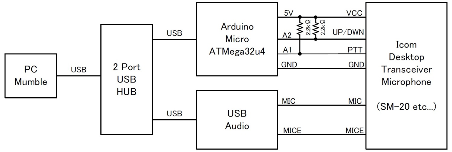 そこで今回は、「アマチュア無線機の固定機用マイクやハンディ機用スピーカーマイクを、そのまま Mumble の操作に使えないだろうか?」というアイデアから、実際にインターフェースを製作してみました。