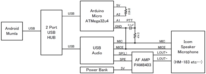 スピーカーマイク内のスピーカーの駆動には、モバイルバッテリー(5V)で十分な出力が取れる、BTL出力のPAM8403を採用しました。BTL出力ではスピーカーとマイクのGND共有ができないため、それぞれのGNDが独立しているタイプのスピーカーマイクを使用する必要があります。