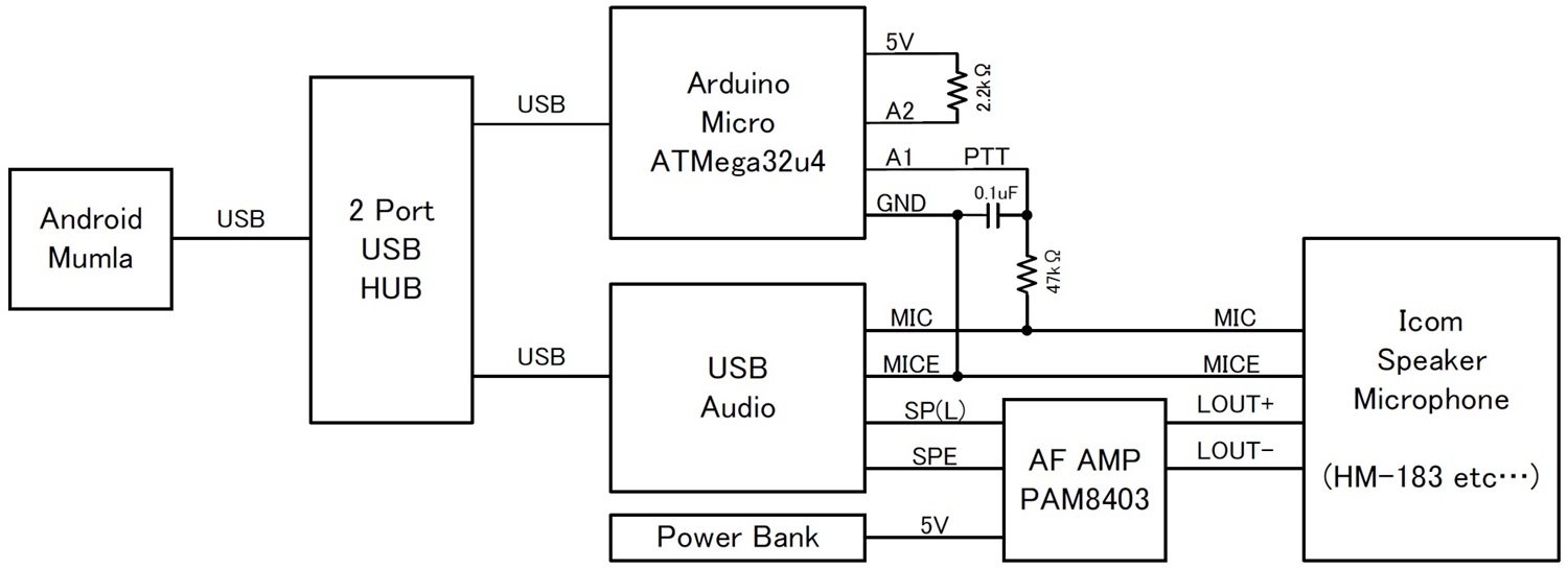 次に、ハンディー機用スピーカーマイクでも同様の仕組みで製作しました。ブロック図は以下のとおりです。