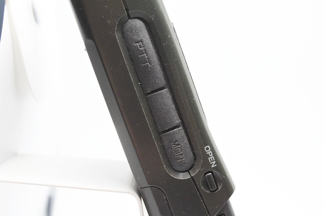 側面にあるPTTとモニターボタン、その下にキーパッドカバーのリリースボタン
