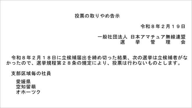2月19日にJARL Webサイトに掲載された令和8年通常選挙の「投票の取りやめ告示」より