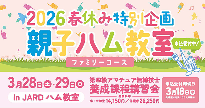 一般財団法人 日本アマチュア無線振興協会(JARD)は、3月28日(土)、29日(日)に「第四級アマチュア無線技士養成課程講習会・親子ハム教室(ファミリーコース)」を開催すると発表し、申込みを受付けている。親子ハム教室は毎年夏休み特別企画として開催され、電波の基礎や無線通信の仕組みを、子どもにも理解しやすい形で学べる内容となっており、今年は春休み期間にも追加開催されるという。