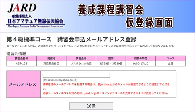 養成課程講習会仮登録画面