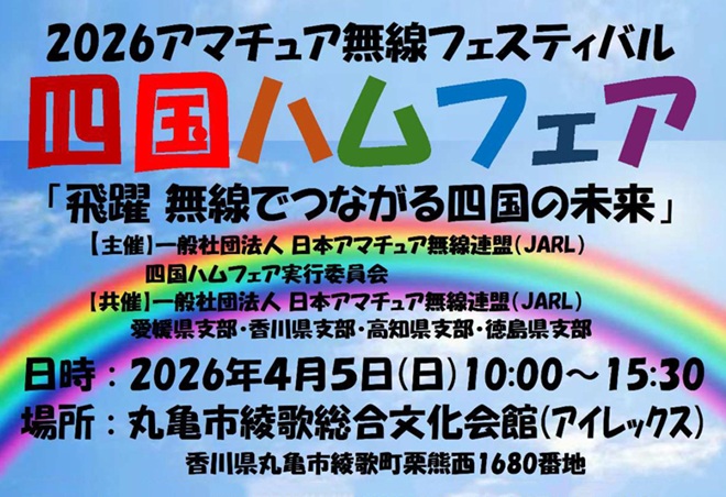 JARL(一般社団法人 日本アマチュア無線連盟)四国地方本部の四国ハムフェア実行委員会は、四国4県(愛媛、香川、高知、徳島)JARL支部との共催で、2026年4月5日(日)に香川県丸亀市の丸亀市綾歌総合文化会館(アイレックス)で、「四国ハムフェア」を初開催する。60以上の企業、団体、個人がブースなどの出展をするほか、各種講演や抽選会などが予定されている。